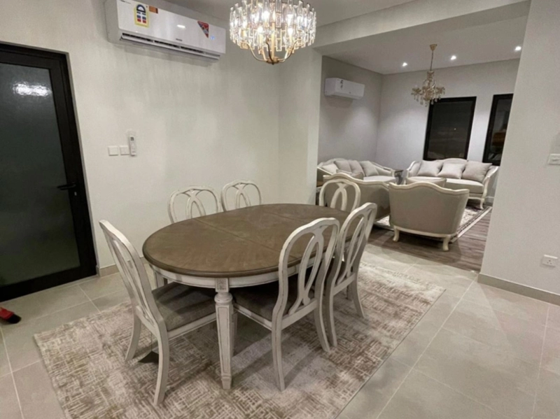 "Villa for sale in Diyar Al Muharraq, consisting of: 3 bedrooms, 5 bathrooms, indoor kitchen, outdoor kitchen, hall, majlis, dining room, maid's room, laundry room, garage for two cars. Land area: 185 square meters. Built-up area: 241 square meters. Selling price: 125,000 Bahraini Dinars."