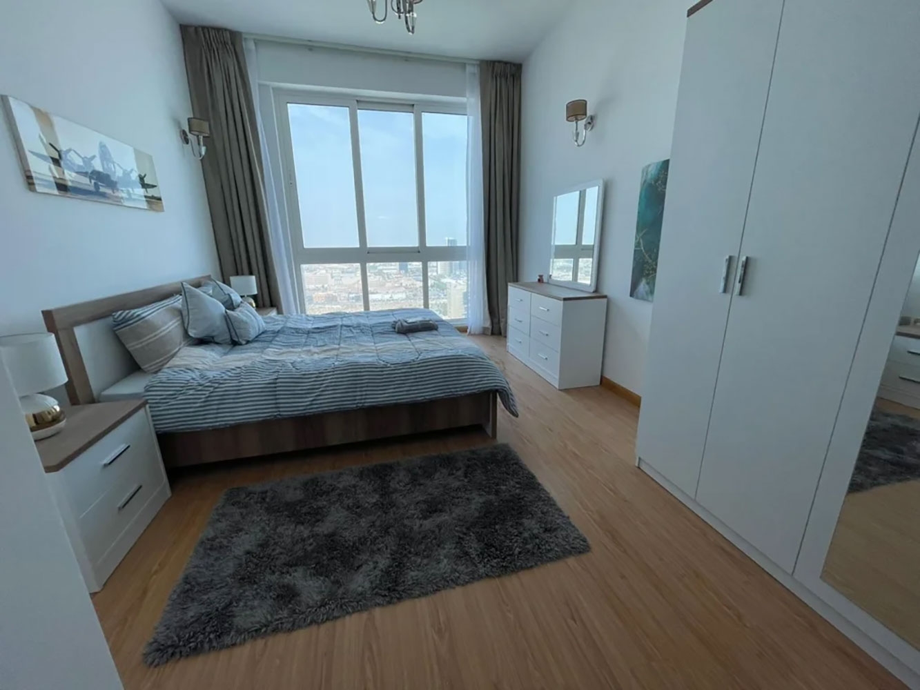 For rent, a brand new fully furnished apartment in the Seef area consisting of one bedroom, two bathrooms, a spacious and bright living room, a dining area, an open kitchen equipped with electrical appliances, a balcony, on the 24th floor, with an area of 78 square meters. The price is 400 Bahraini Dinars monthly, with an EWA limit of BHD 20.
